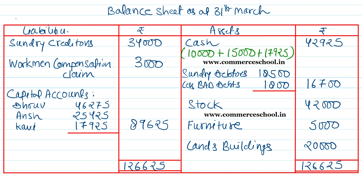 [Ans.: Gain on Revaluation ₹ 4,700; Capital A/cs: Dhruv ₹ 46,275; Ansh ₹ 25,425 and Kavi ₹ 17,925; B/S Total ₹ 1,26,625.]