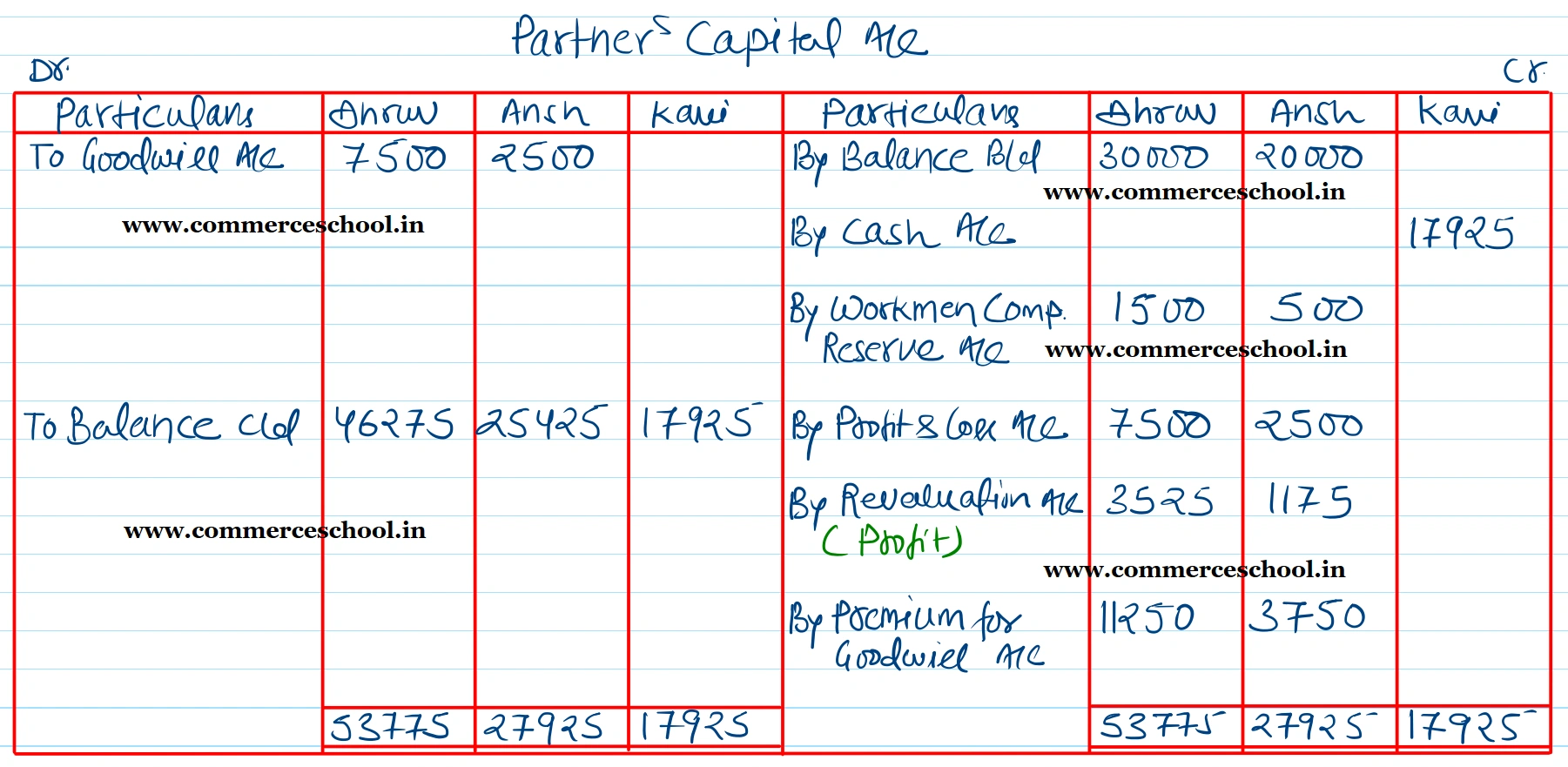 (vi) Kavi is to pay ₹ 15,000 to the existing partners as premium for Goodwill for 20% of the future profits of the firm. He is also to bring in capital equal to 1/4th of the combined capitals of Dhruv and Ansh.