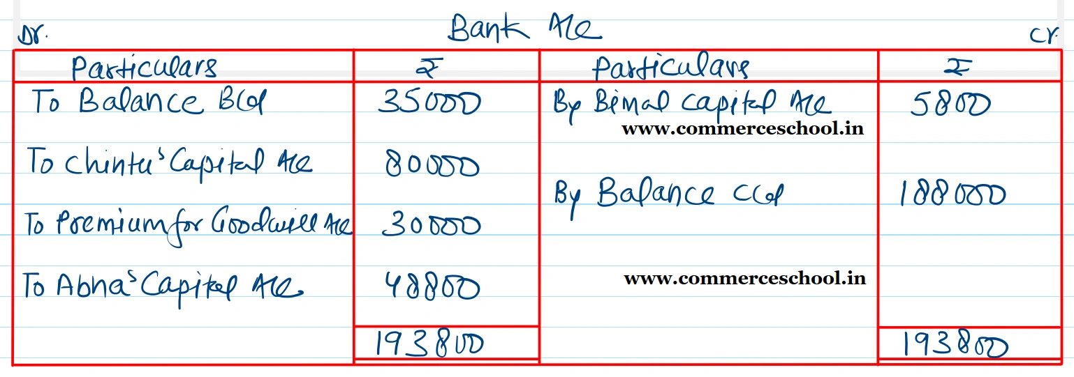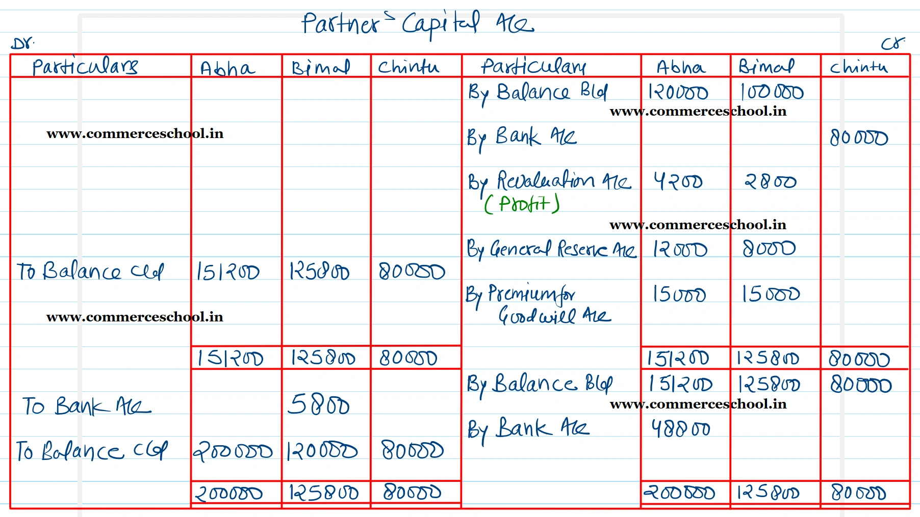 [Ans. Final Capitals: Abha ₹ 2,00,000, Bimal ₹ 1,20,000 and Chintu ₹ 80,000. Abha brings in ₹ 48,800 and Bimal withdraws ₹ 5,800. Bank Balance ₹ 1,88,000.]