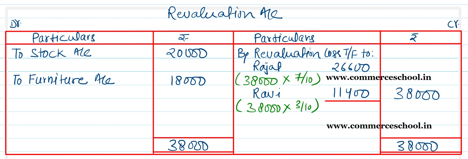 [Ans. Loss on Revaluation ₹ 38,000; New Ratio 21 : 9 : 10; Capital Accounts Rajat ₹ 1,26,000; Ravi ₹ 54,000 and Rohan ₹ 60,000; Deficit Capital brought in by Rajat in Cash ₹ 38,600; Surplus Capital returned to Ravi in Cash ₹ 20,600. Balance of Cash A/c ₹ 1,24,000.]