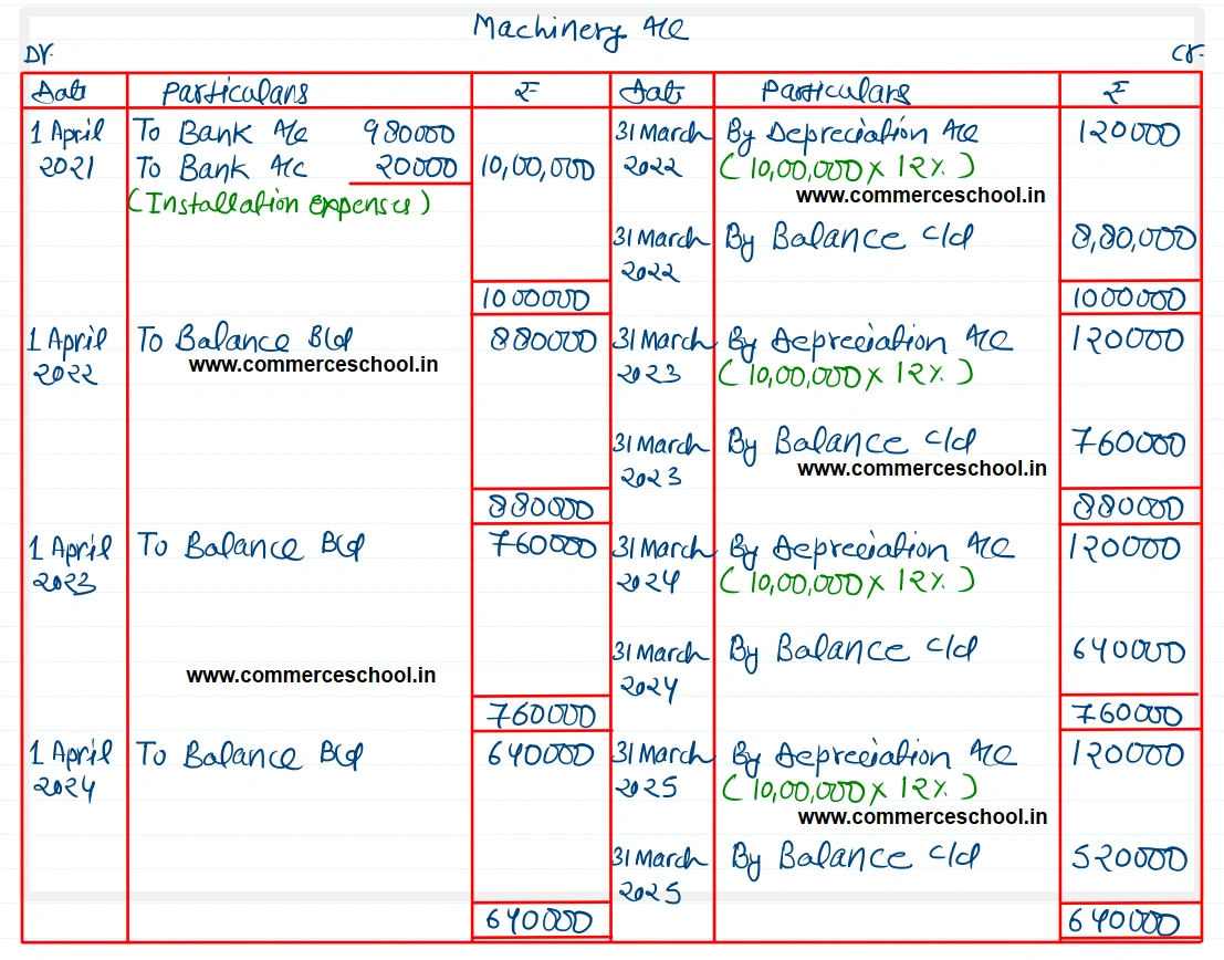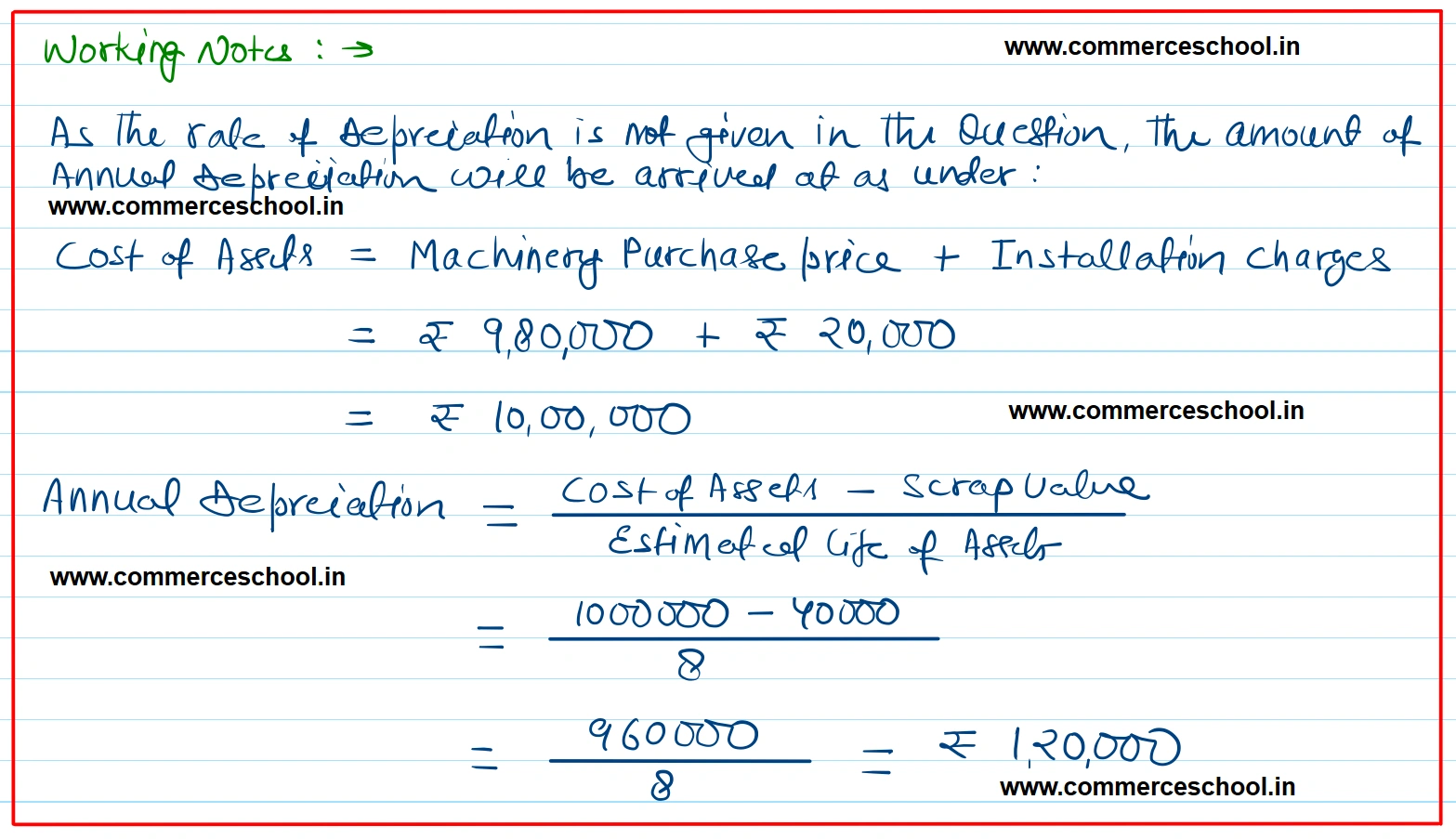 On 1st April, 2021, a limited company purchased a Machine for ₹ 9,80,000 and spent ₹ 20,000 on its installation. At the date of purchase, it was estimated that the scrap value of the machine would be ₹ 40,000 at the end of the eighth year.