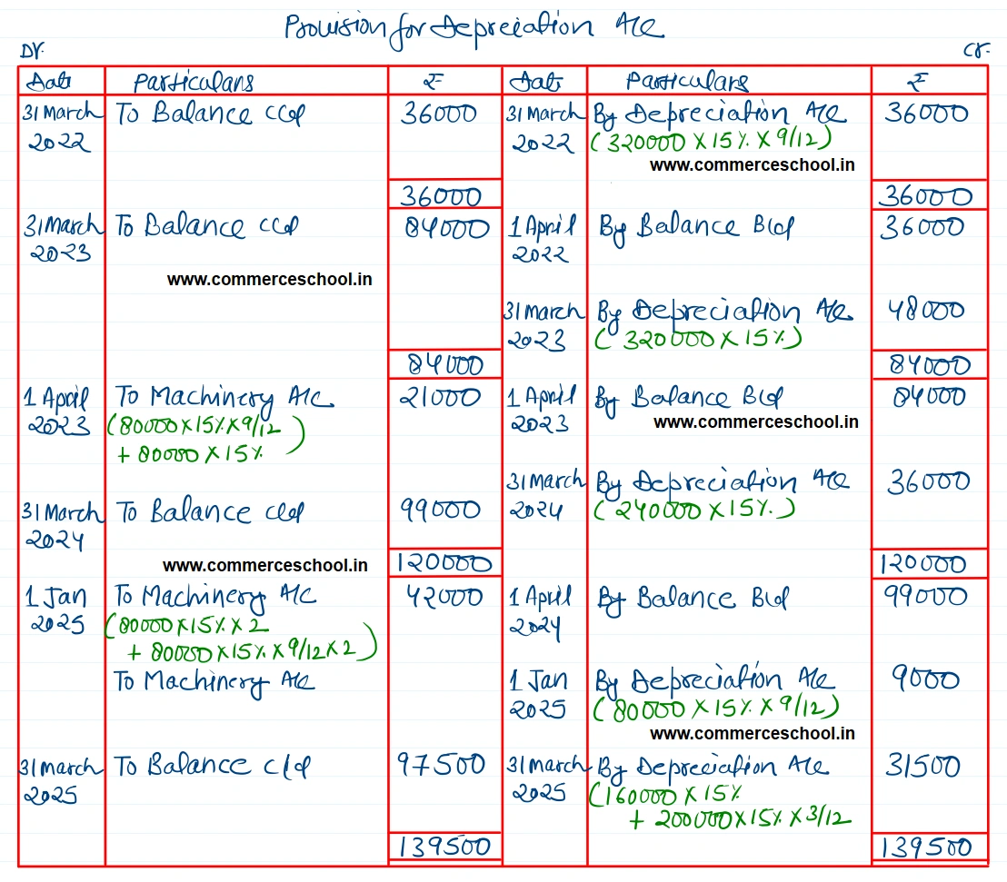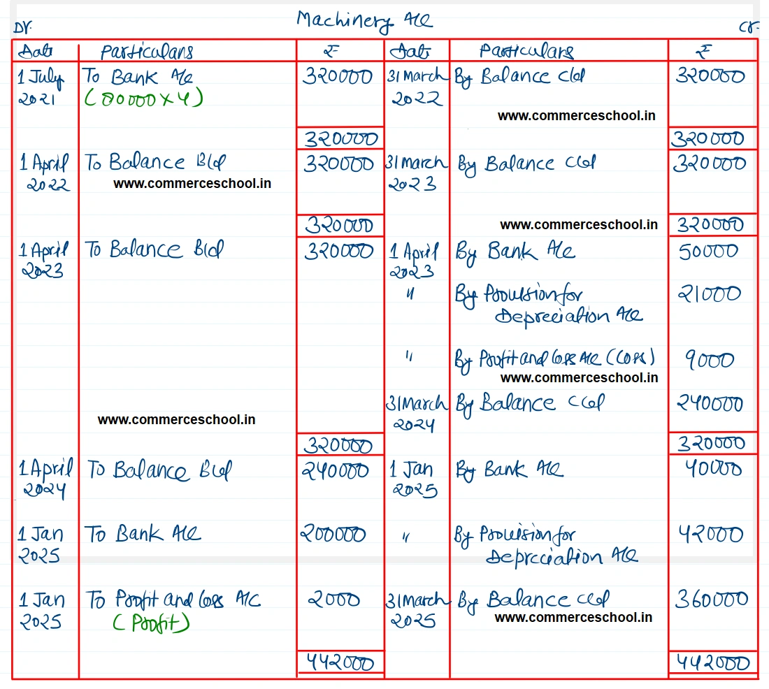 [Ans. Balance of Machinery A/c on 31st March, 2025 ₹ 3,60,000; Balance of Provision for Depreciation A/c on 31st March, 2025 ₹ 97,500; Loss on sale of first Machine ₹ 9,000; Gain on sale of second Machine ₹ 2,000.]