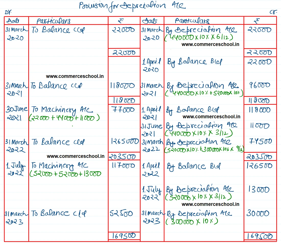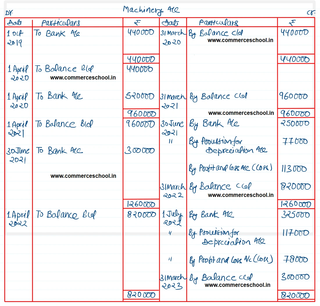 X Ltd. which closes its books of account every year on 31st March, purchased on 1st October, 2019 machinery costing ₹ 4,40,000. It purchased further machinery on 1st April, 2020 costing ₹ 5,20,000. On 30th June, 2021, the first machine was sold for ₹ 2,50,000 and on the same date a fresh machine was installed at a cost of ₹ 3,00,000. On 1st July 2022, the second machine purchased on 1st April 2020 was also sold for ₹ 3,25,000.