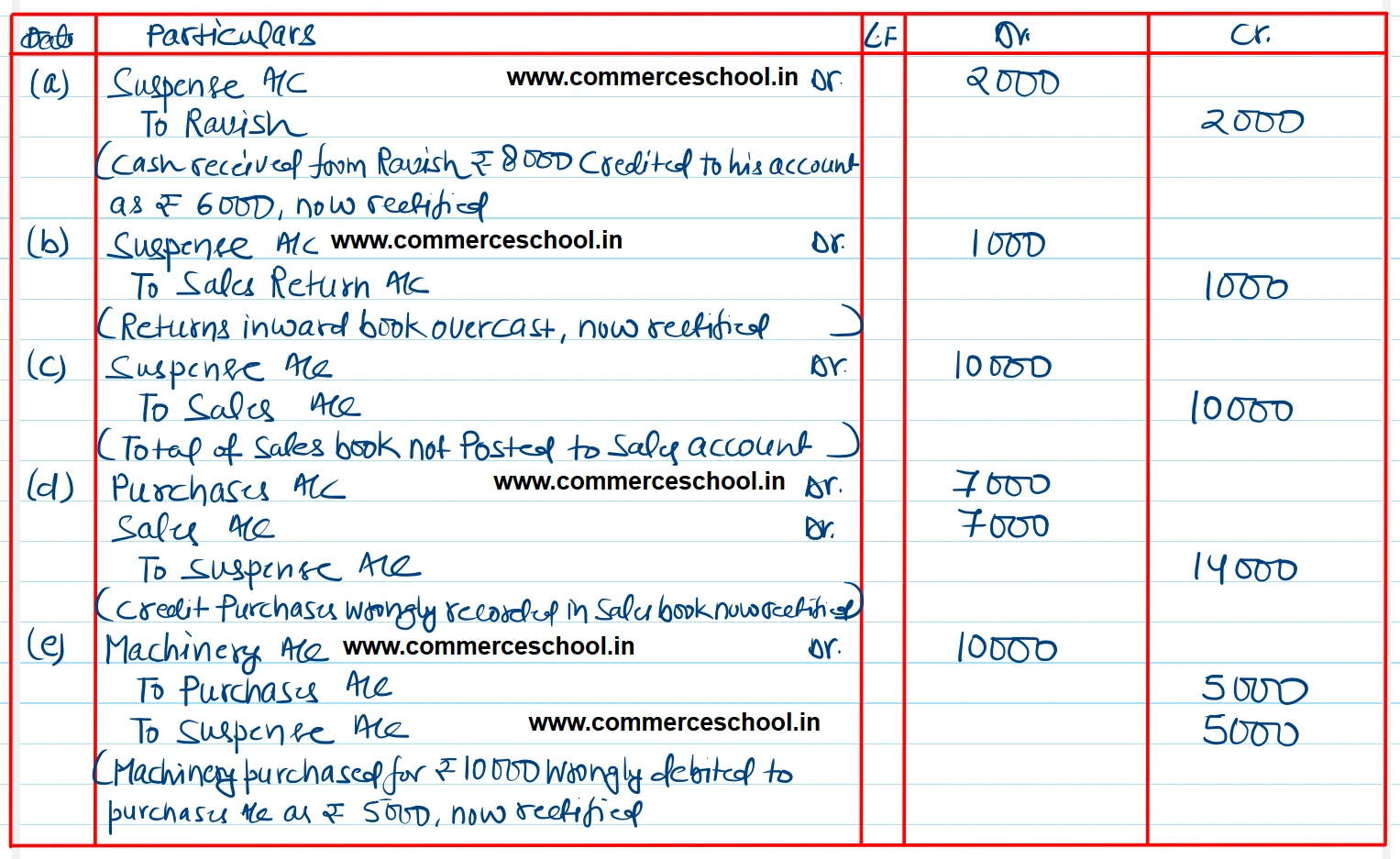 (a) Cash received from Ravish ₹ 8,000 posted to his account as ₹ 6,000.