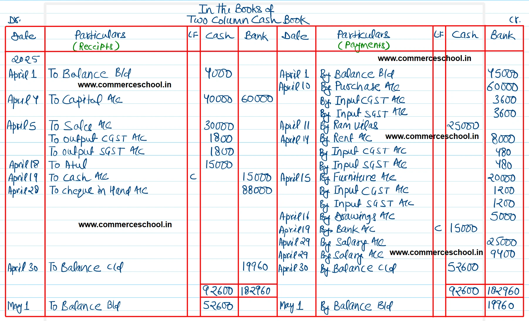 | April 1 | Balance of Cash in hand ₹ 4,000, overdraft at Bank ₹ 45,000 |