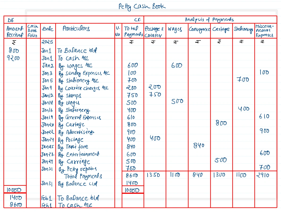 Record the following transactions in a Petty Cash Book drawn with suitable Columns and then balance the same: Petty cashier is given a monthly imprest amount of ₹ 10,000. He spent last month ₹ 9,200 and got the balance from the head cashier today