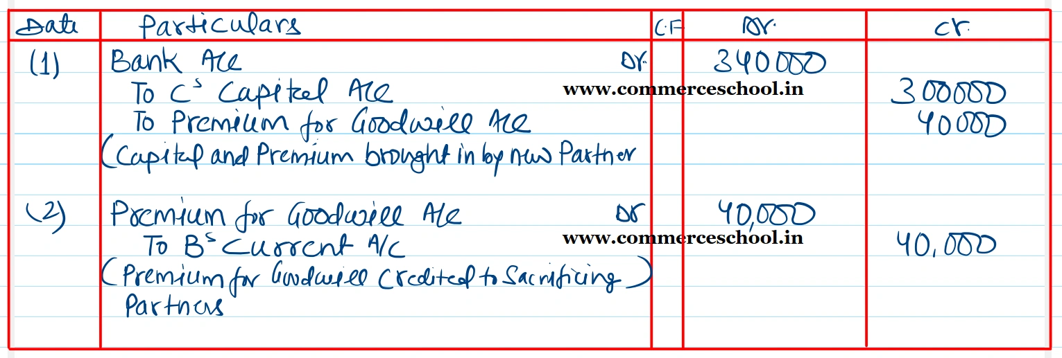 A and B were partners with fixed capitals of ₹ 3,70,000 each. They admitted C as a new partner for 1/4th share of profits. C brought ₹ 3,00,000 as his capital and the necessary amount of goodwill premium for his share of goodwill