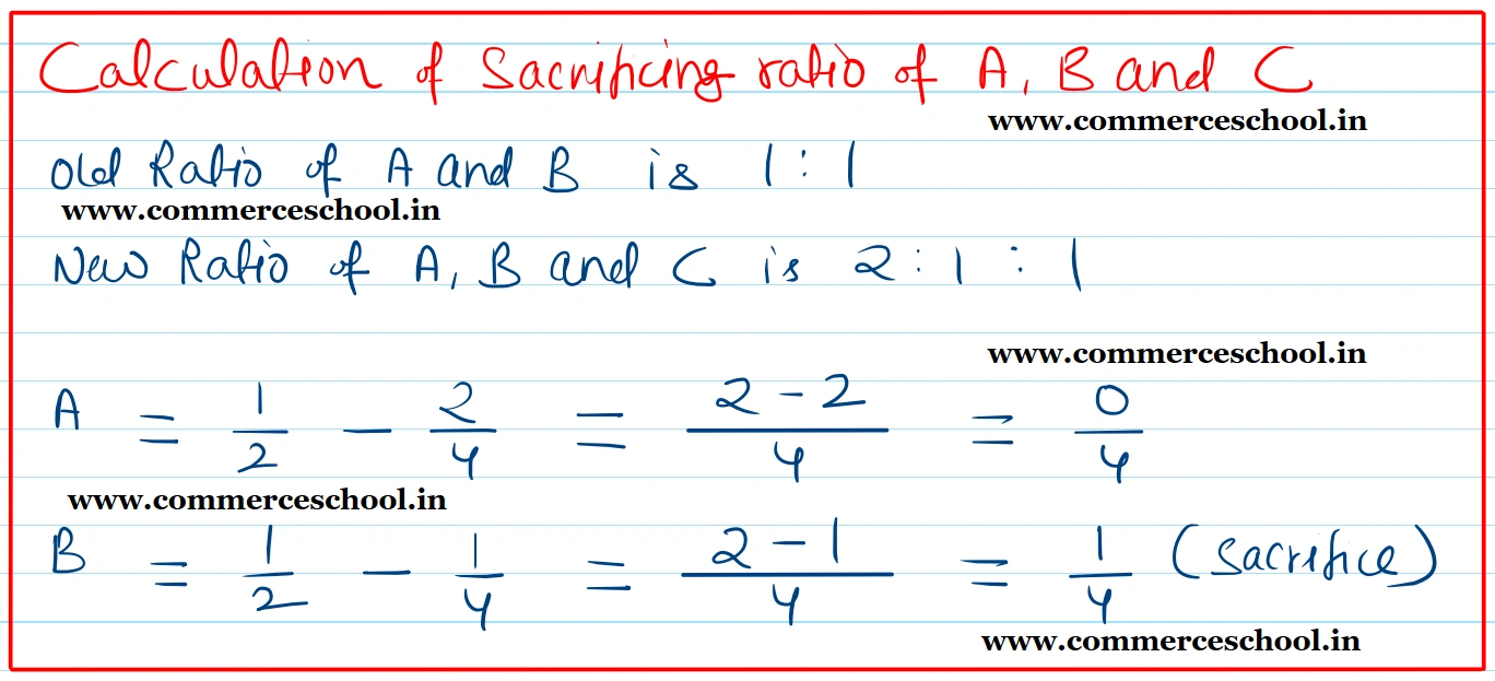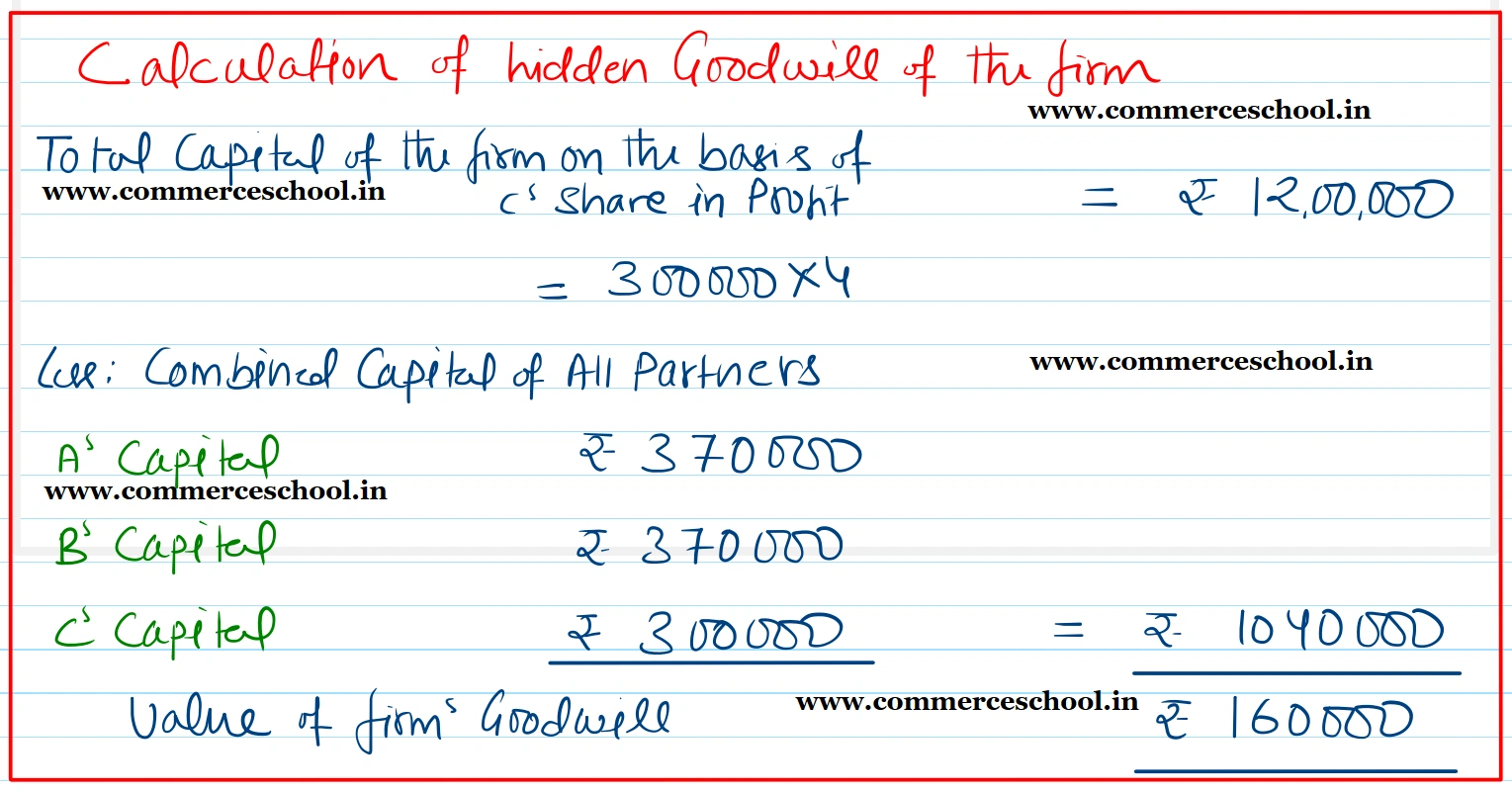 [Ans. Hidden Goodwill ₹ 1,60,000. Entire amount of goodwill ₹ 40,000 brought in be C will be credited to B’s Current A/c since he alone has sacrificed.]