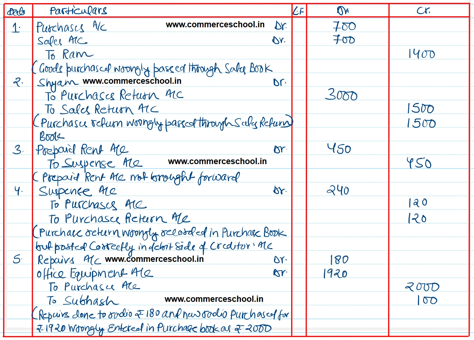 (1) Goods purchased from Ram ₹ 700 was passed through sales book.