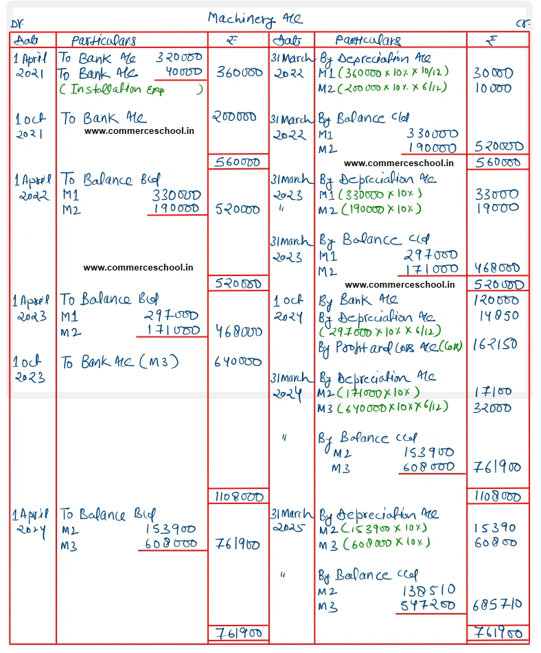 On 1st Oct., 2023, the Machinery bought on 1st April, 2021 was sold off for ₹ 1,20,000 and on the same date a fresh Machine was purchased for ₹ 6,40,000. Depreciation is provided annually on 31st March, @ 10% p.a. on the Written Down Value Method. Show the Machine A/c from 1st April, 2021 to 31st March, 2025.