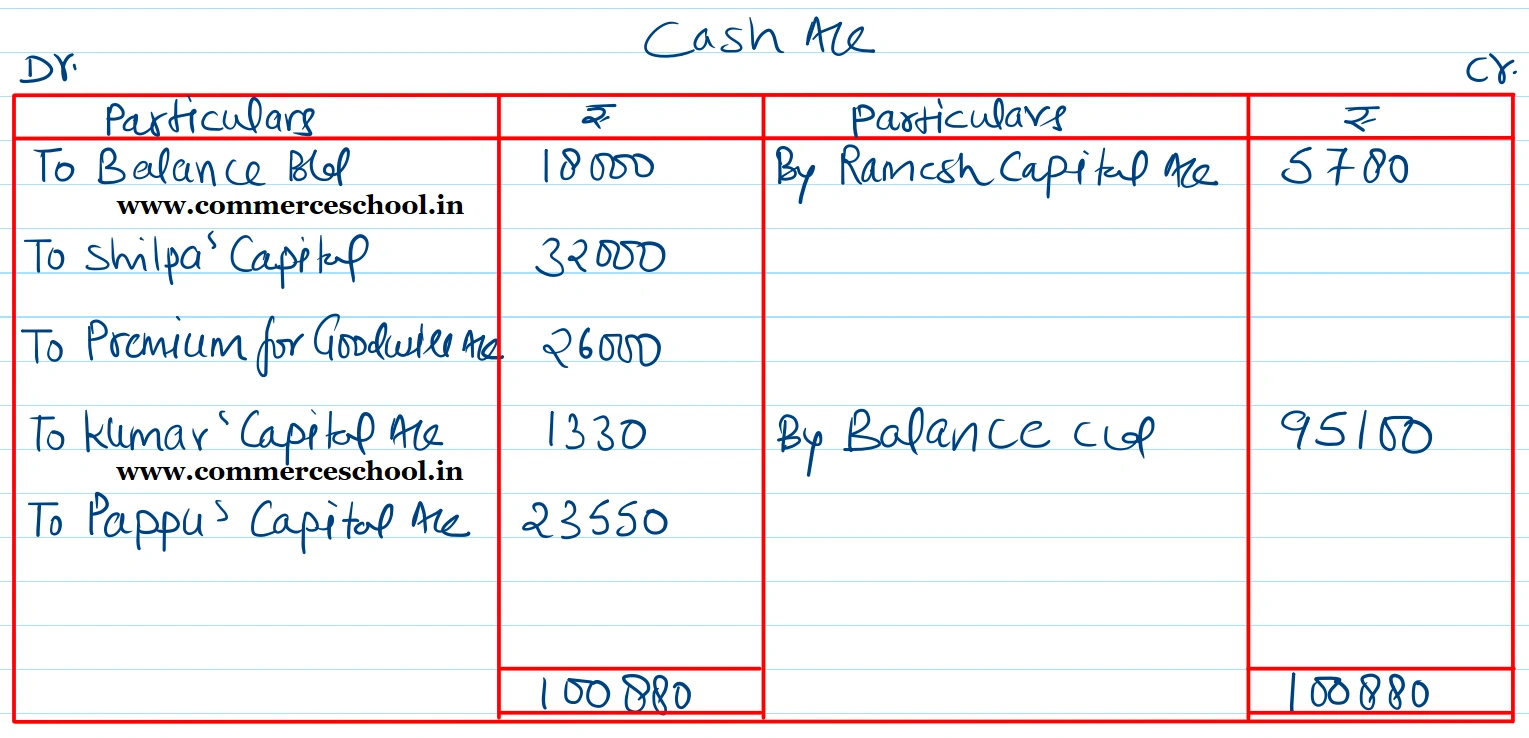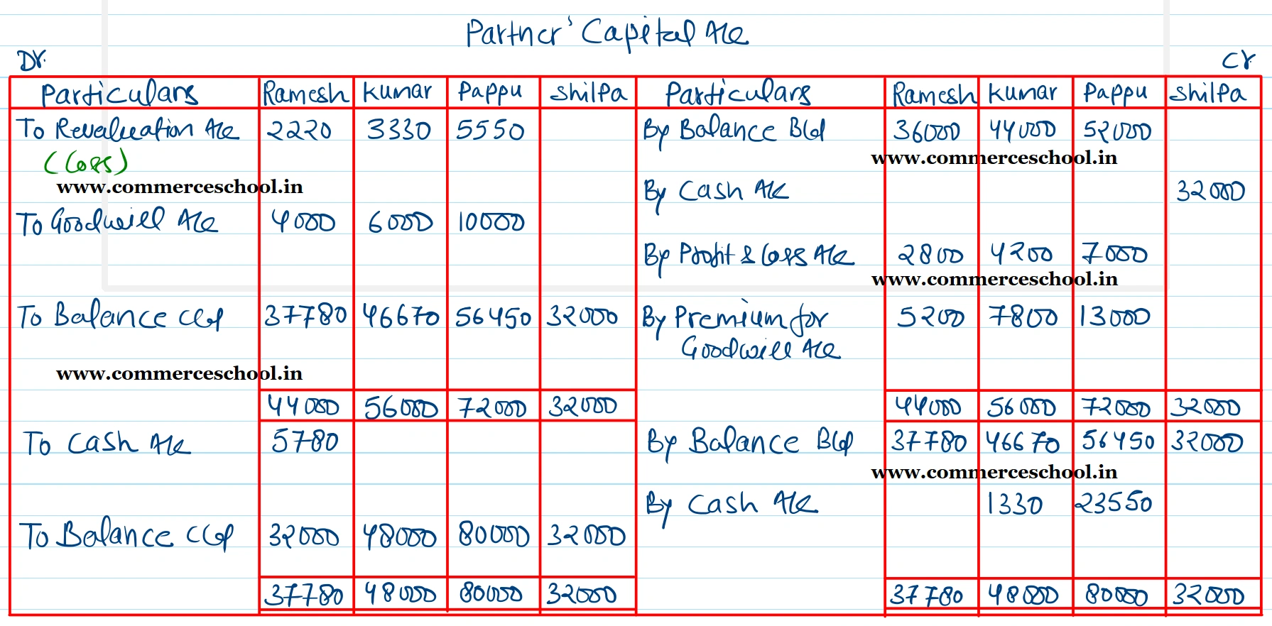 [Ans. Loss on Revaluation ₹ 11,100; Capital Accounts : Ramesh ₹ 32,000; Kumar ₹ 48,000; Pappu ₹ 80,000 and Shilpa ₹ 32,000; Cash Balance ₹ 95,100; B/S Total ₹ 2,89,800; Ramesh withdraws ₹ 5,780; Kumar brings in ₹ 1,330 and Pappu brings in ₹ 23,550.]