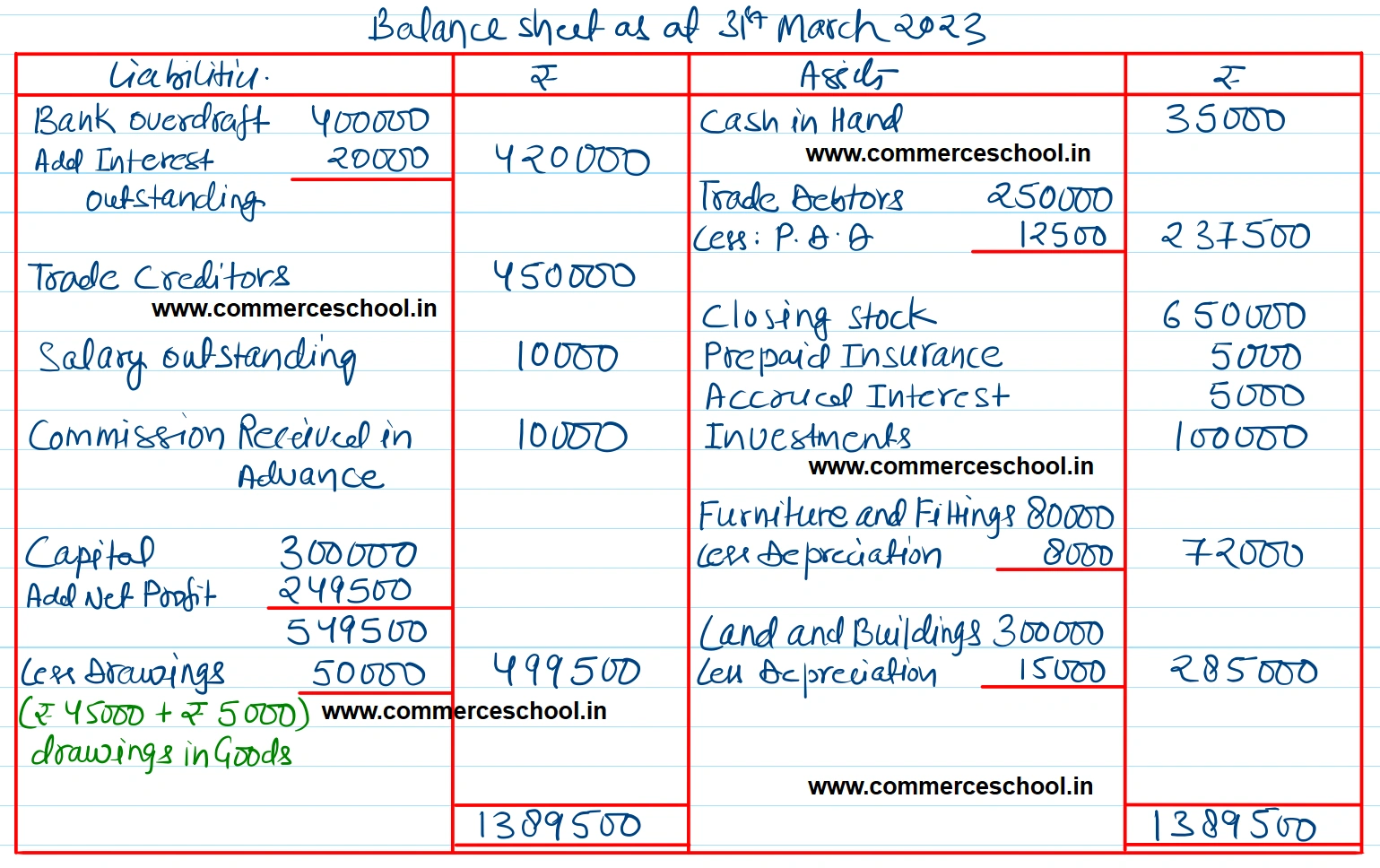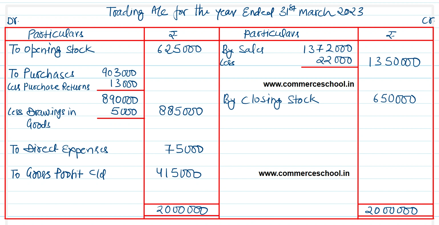 Additional Information: (i) Closing stock on 31st March, 2023 is valued at ₹ 6,50,000. Goods worth ₹ 5,000 are reported to have been taken away by the proprietor for his personal use at home during the year. (ii) Interest on investments ₹ 5,000 is yet to be received while ₹ 10,000 of the commission received is yet to be earned. (iii) ₹ 5,000 of the fire insurance premium paid is in respect of the quarter ending 30th June, 2023. (iv) Salaries ₹ 10,000 for March, 2023 and bank overdraft interest estimated at ₹ 20,000 are yet to be recorded as oustanding charges. (v) Depreciation is to be provided on land and buildings @ 5% per annum and on furniture and fitting @ 10% per annum. (vi) Make a provision for doubtful debts @ 5% of trade debtors. [Ans. Gross Profit ₹ 4,15,000; Net Profit ₹ 2,49,500; Balance Sheet Total ₹ 13,89,500.] Solution:-
