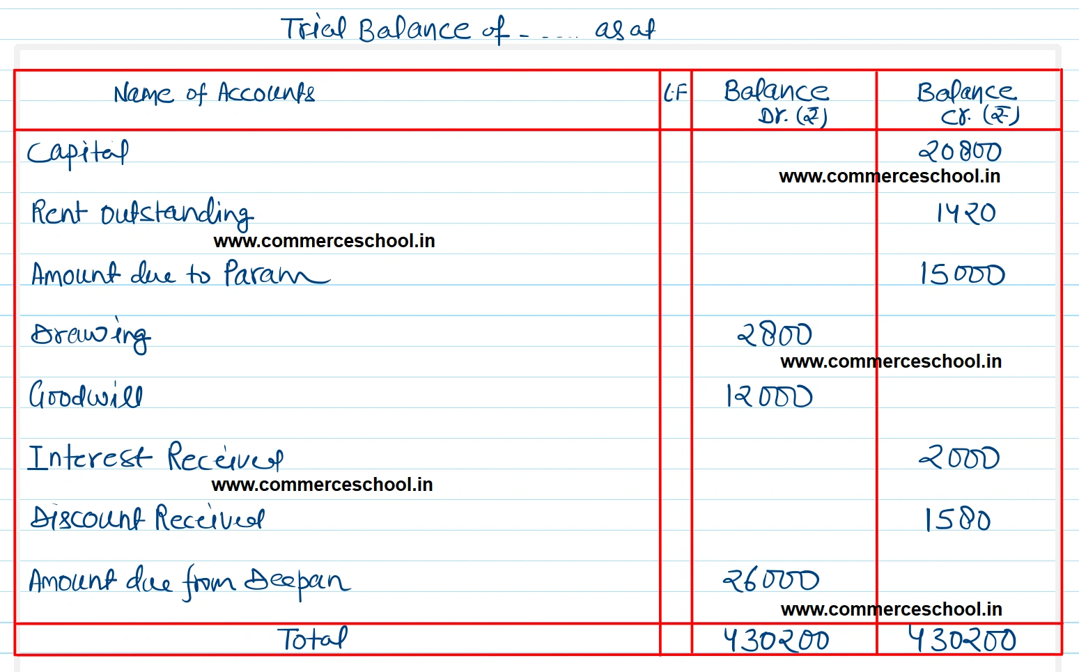 Capital ₹ 20,800, Rent outstanding ₹ 1,420, Amount due to Param, ₹ 15,000, Drawing ₹ 2,800, Goodwill ₹ 12,000, Interest received ₹ 2,000, Discount received ₹ 1,580, Amount due from Deepan ₹ 26,000.