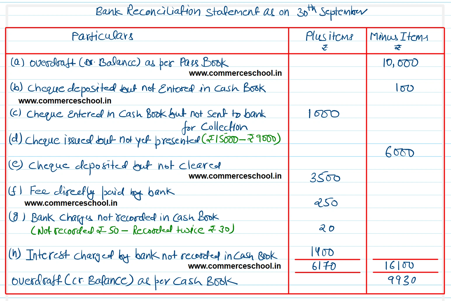 (d) Several cheques were drawn in the last week of September, totalling ₹ 15,000; of these cheques totalling only ₹ 9,000 were cashed before 30th September.