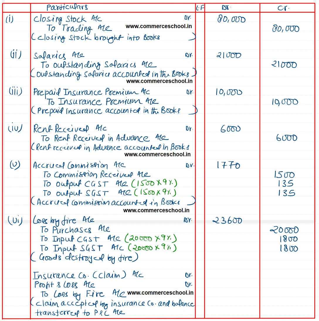 (vi) Goods costing ₹ 20,000 destroyed by fire and insurance company admitted a claim for ₹ 15,000 only.