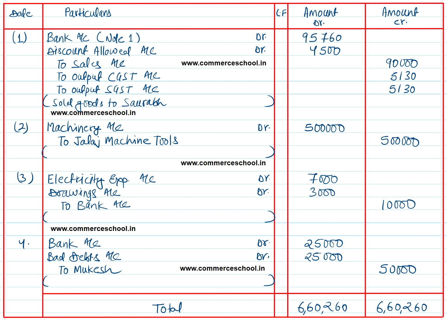(1) Sold goods to Saurabh of the list price of ₹ 1,00,000 Less trade discount of 10% 2ith CGST and SGST @ 6% each, allowed cash discount 5%.