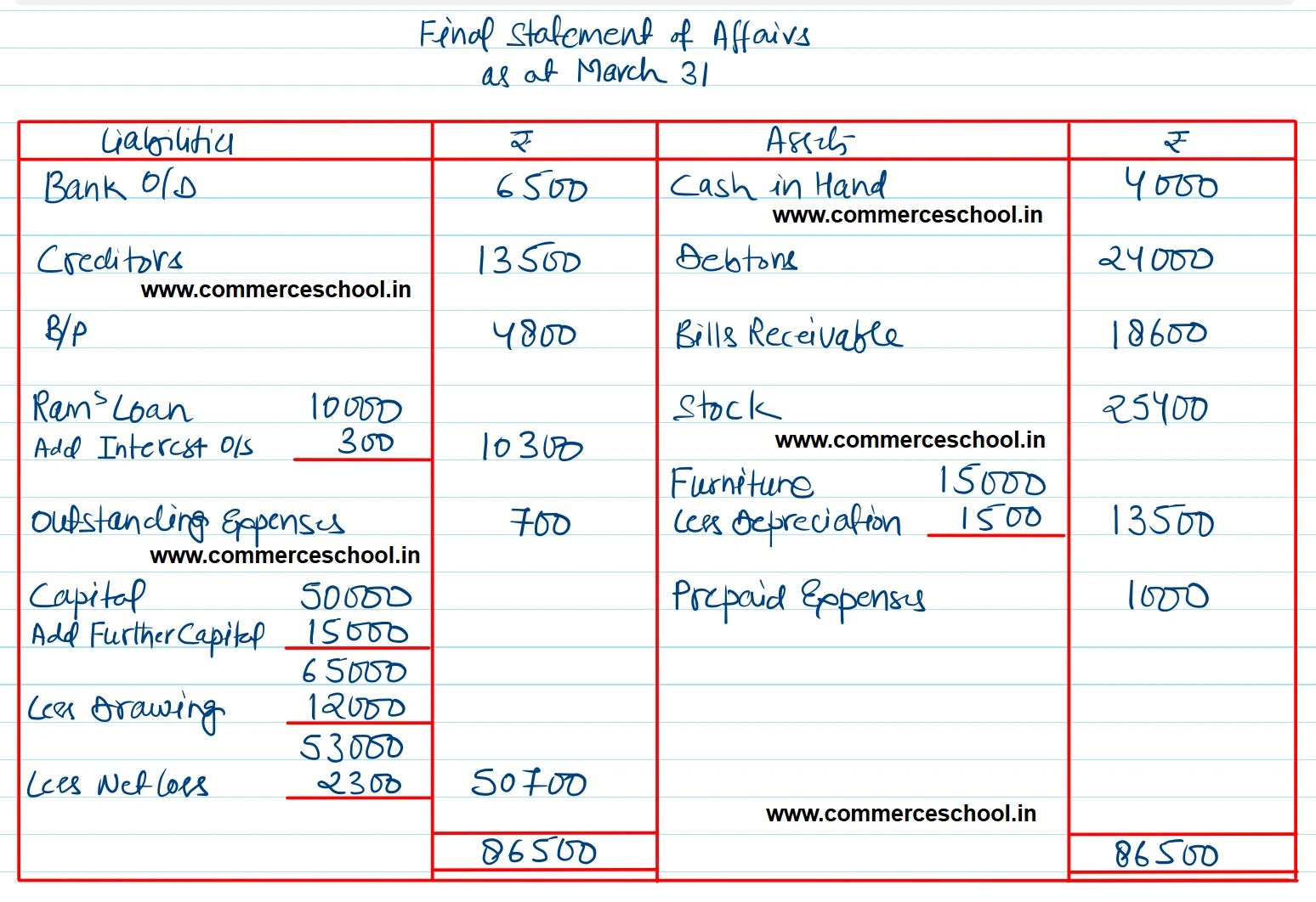Assets: Cash in hand ₹ 4,000; Bank (Cr.) ₹ 6,500; Debtors ₹ 24,000; B/R ₹ 18,600. Stock ₹ 25,400; Furniture ₹ 15,000; Prepaid expenses ₹ 1,000.