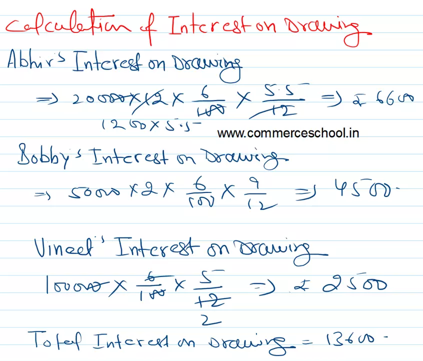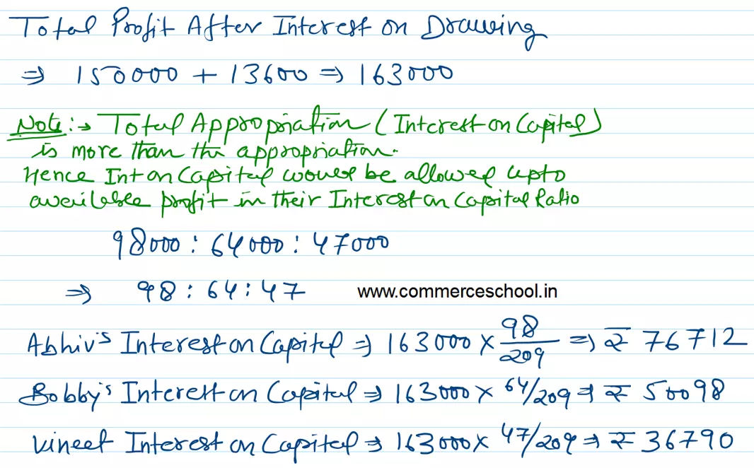 Subsequently, it was discovered that interest on capital and interest on drawings had been mitted. The partners were entitled to interest on capital @ 10% p.a. and were to be charged interest on drawings @ 6% p.a. The drawings during the year were: Abhir – ₹ 20,000 drawn at the end of each month, Bobby – ₹ 50,000 drawn at the beginning of every half year, and Vineet – ₹ 1,00,000 withdrawn on 31st October 2017. The net profit for the year ended 31st March 2018 was ₹ 1,50,000. The profit-sharing ratio was 2 : 2 : 1.