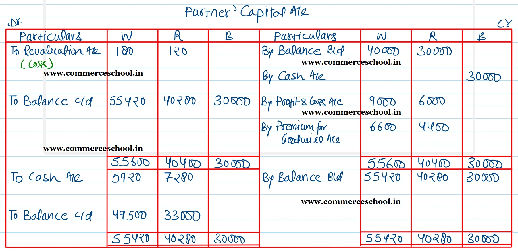 [Ans. Loss on Revaluation ₹ 300; New Ratio 33 : 22 : 20; Capital Accounts : W ₹ 49,500, R ₹ 33,000 and B ₹ 30,000; Cash Balance ₹ 32,800; B/S Total ₹ 1,32,500; W withdraws ₹ 5,920 and R withdraws ₹ 7,280.]