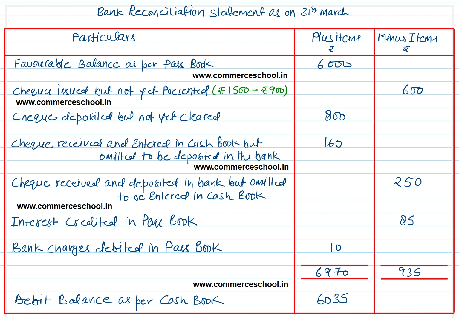 On 31st March 2025 your bank Pass Book showed a balance of ₹ 6,000 to your credit. Before that date you had issued cheques amounting to ₹ 1,500 of which cheques worth ₹ 900 only have been presented. You also deposited cheques worth ₹ 2,000 of which cheque of ₹ 800 paid by you into bank on 29th March is not yet credited in Pass Book. You had also received a cheque for ₹ 160 which although entered by you in the bank column of the Cash Book, was omitted to be paid into the bank. On 31st March a cheque of ₹ 250 received by you was paid into the bank but the same was omitted to be entered in the cash book. There was a credit of ₹ 85 for interest on current account and debit of ₹ 10 for bank charges. Draw up a Reconciliation Statement showing adjustment between your Cash Book and Pass Book.