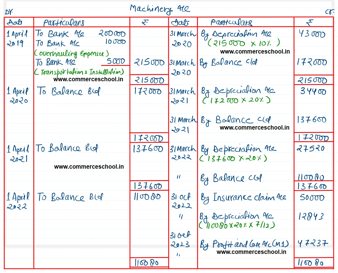 The plant was destroyed by fire on Oct. 31, 2022 and an insurance claim of ₹ 50,000 was admitted by the insurance company. Prepare plant account assuming that the company closes its books on March 31, every year.