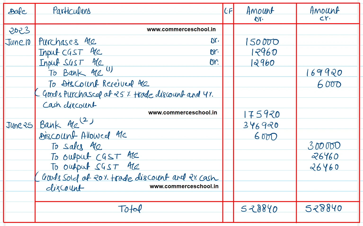Ignore adjustment and payment of GST. [Ans. Total ₹ 5,28,840; June 10: Net amount paid ₹ 1,69,920; Discount Received ₹ 6,000. June 25: Net amount received ₹ 3,46,920; Discount allowed ₹ 6,000.]