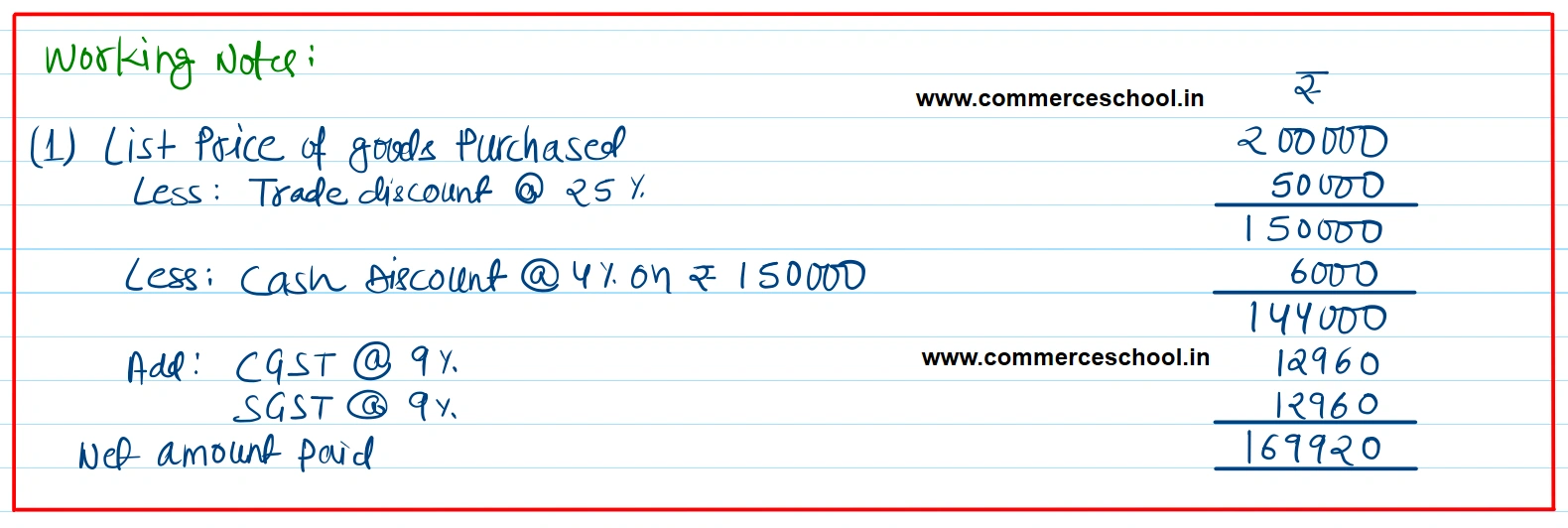 June 10 Purchased goods from Ravichandran of Madurai of the list price of ₹ 2,00,000 at 25% trade discount at 4% cash discount on purchase price of goods. Paid CGST and SGST @ 9% each. Paid the entire amount by cheque on the same date.