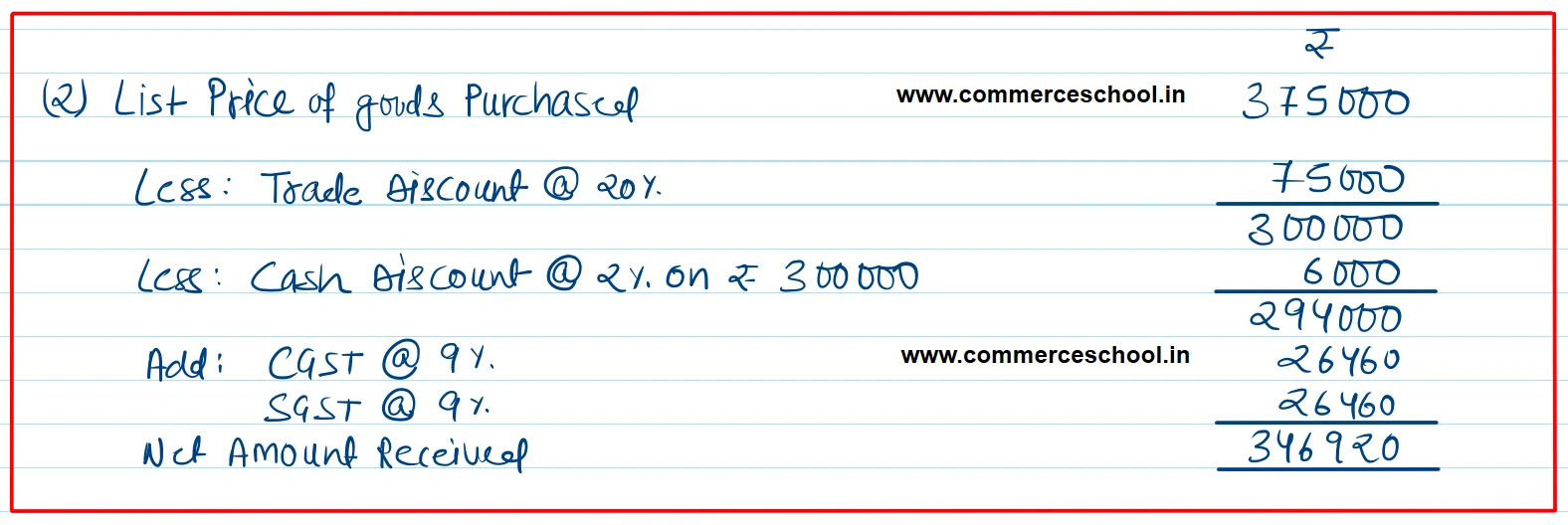 June 25 Sold goods to Ramalingam of Erode of the list price of $ 3,75,000 at 20% trade discount and 2% cash discount on sale price. Charged CGST and SGST @ 9% each. Full amount was received by cheque on the same date.