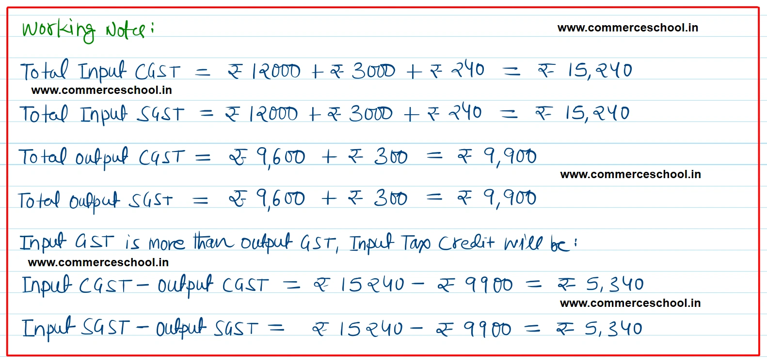 [Ans. Total ₹ 4,89,080; Input CGST and Input SGST ₹ 15,240 each. Output CGST and Output ₹ 9,900 each. Input Tax Credit: CGST ₹ 5,340 and SGST ₹ 5,340.]