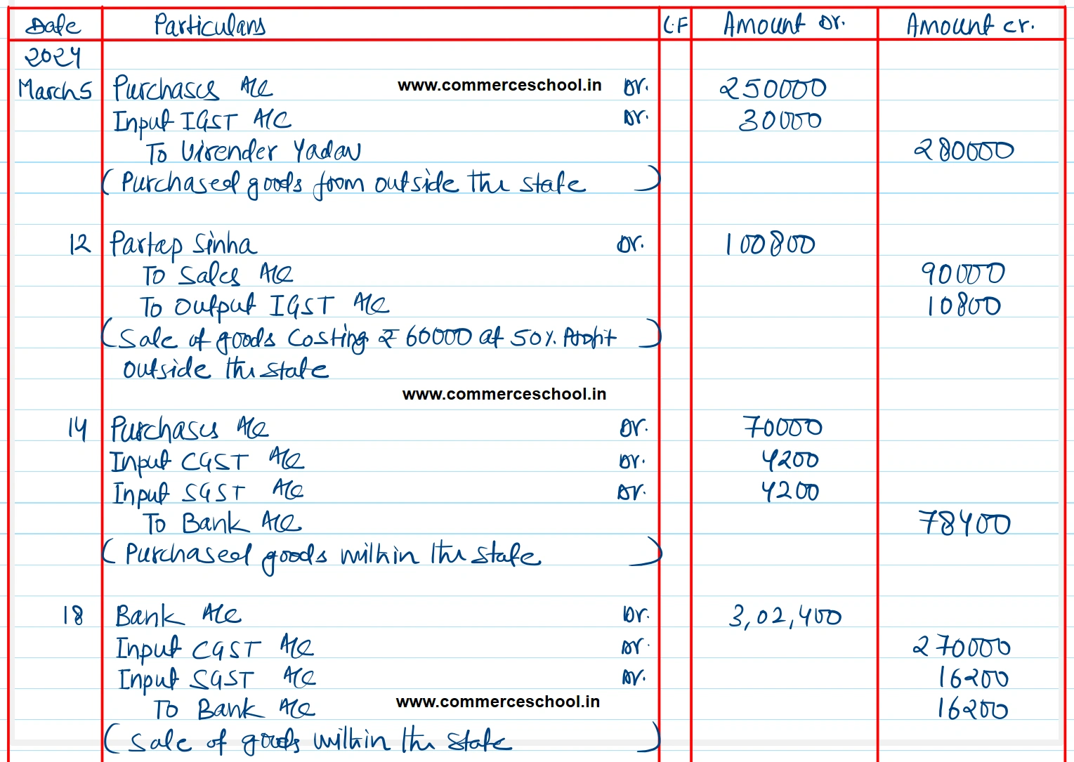 | March 5 | Purchased goods for ₹ 2,50,000 from Virender Yadav of Patna (Bihar) |