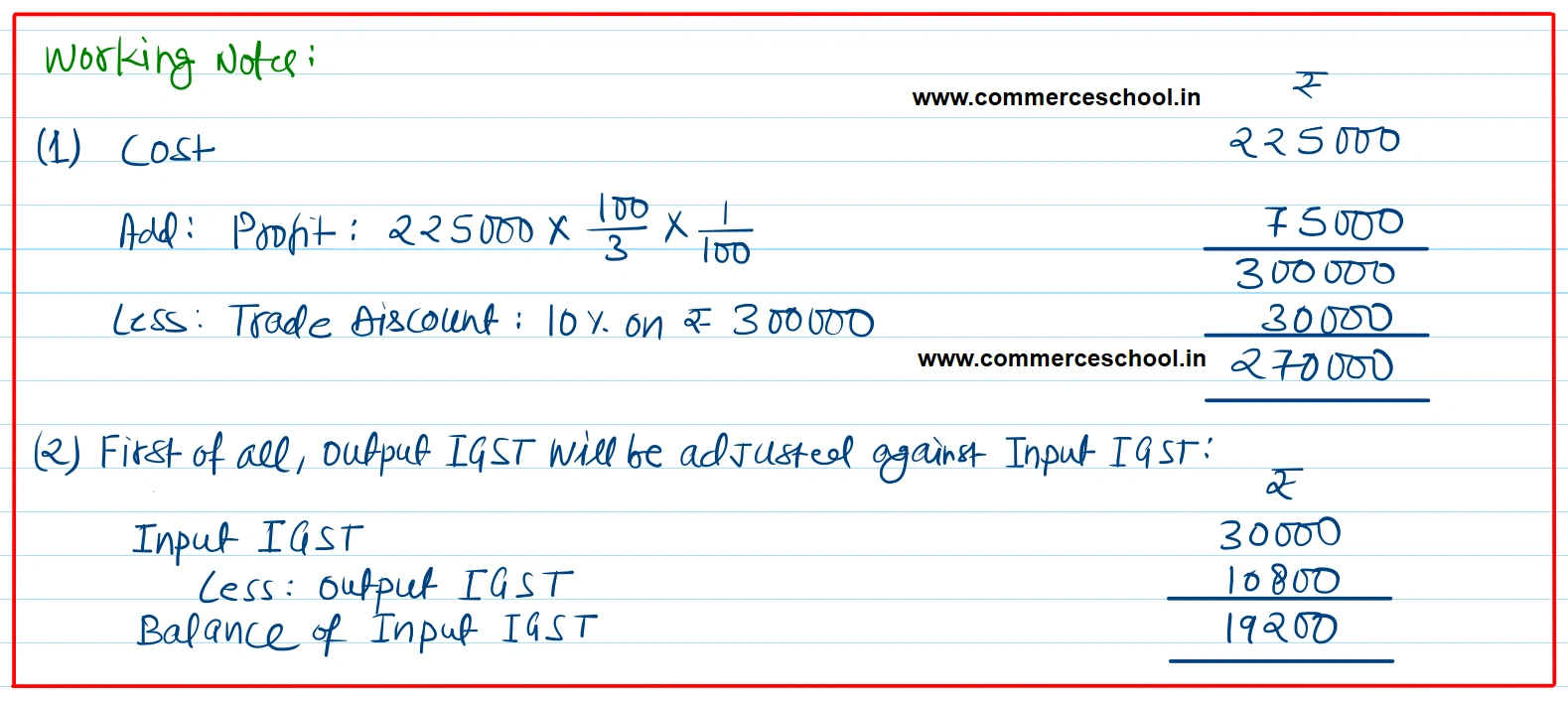 | March 18 | Sold good at Varanasi (U.P.) Costing ₹ 2,25,000 at 331/3% profit less trade discount 10% against cheque which was deposited into bank. |