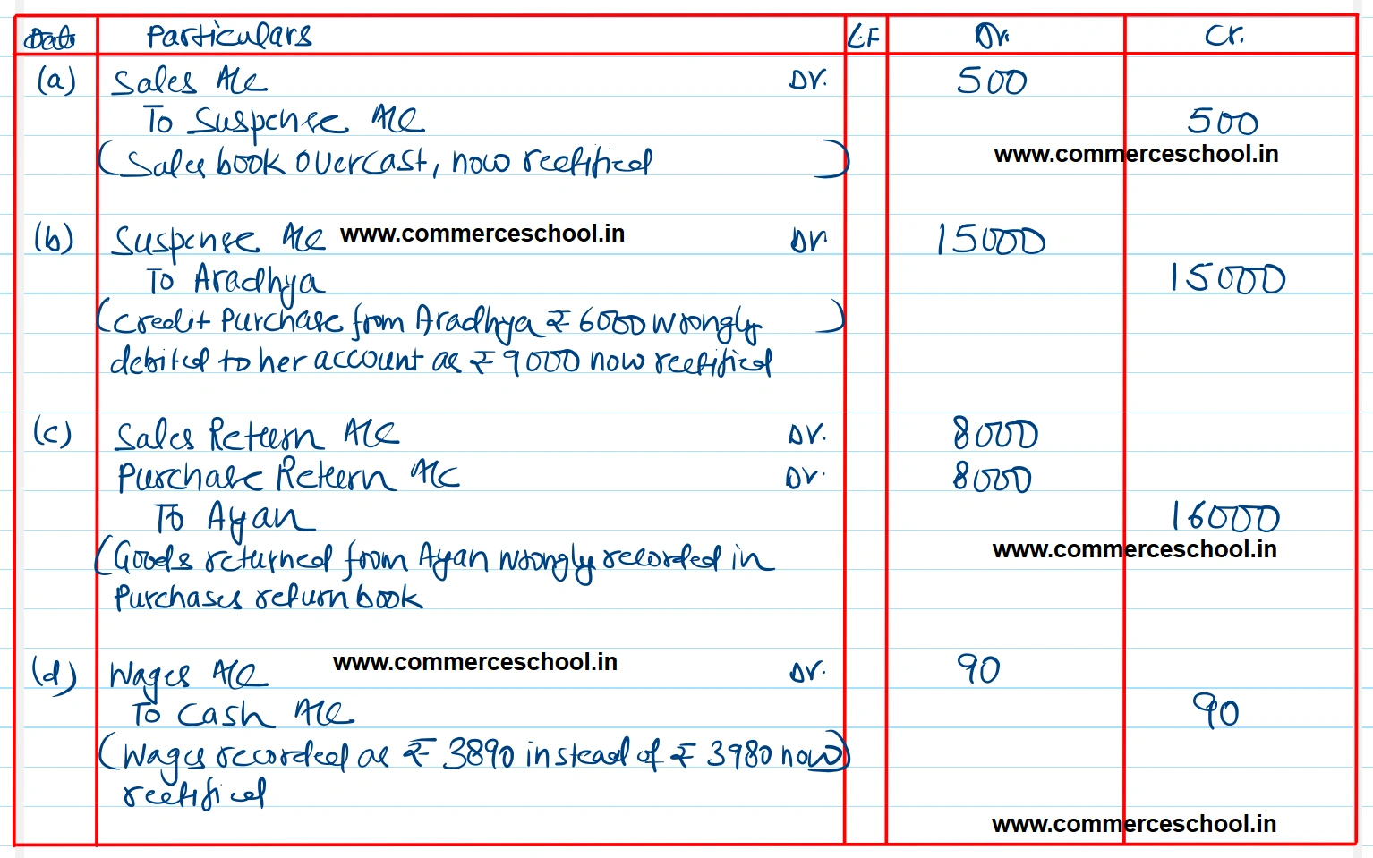 (d) Wages paid ₹ 3,980 were recorded in the Cash Book as ₹ 3,890.