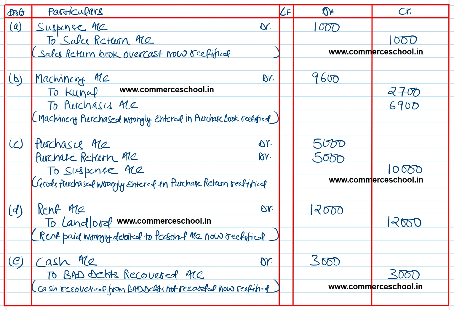(b) Machinery purchased ₹ 9,600 from Kunal, wrongly entered in Purchase Book as ₹ 6,900.