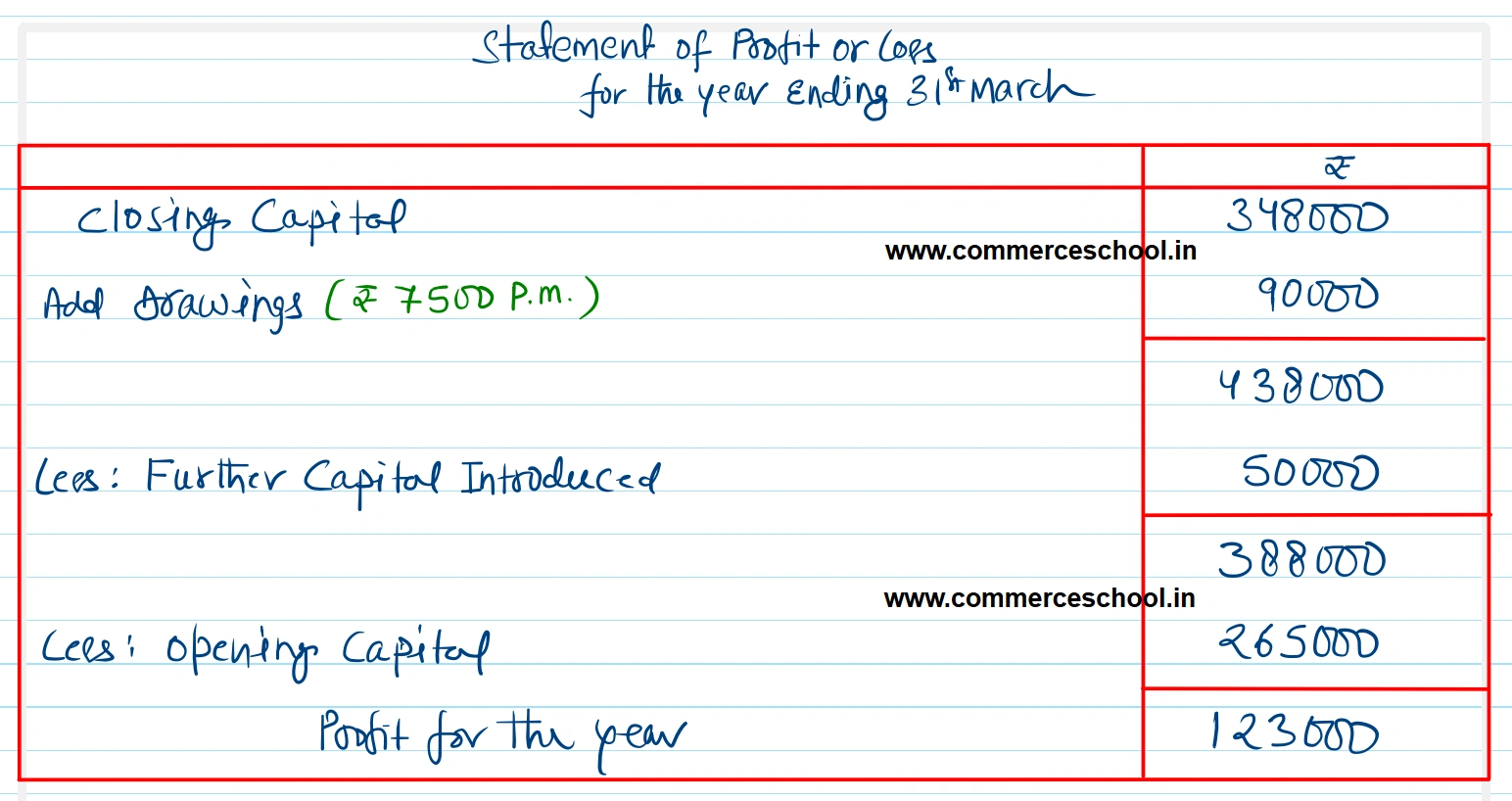 [Ans. Opening Capital ₹ 2,65,000; Closing Capital ₹ 3,48,000 and Profit ₹ 1,23,000.]