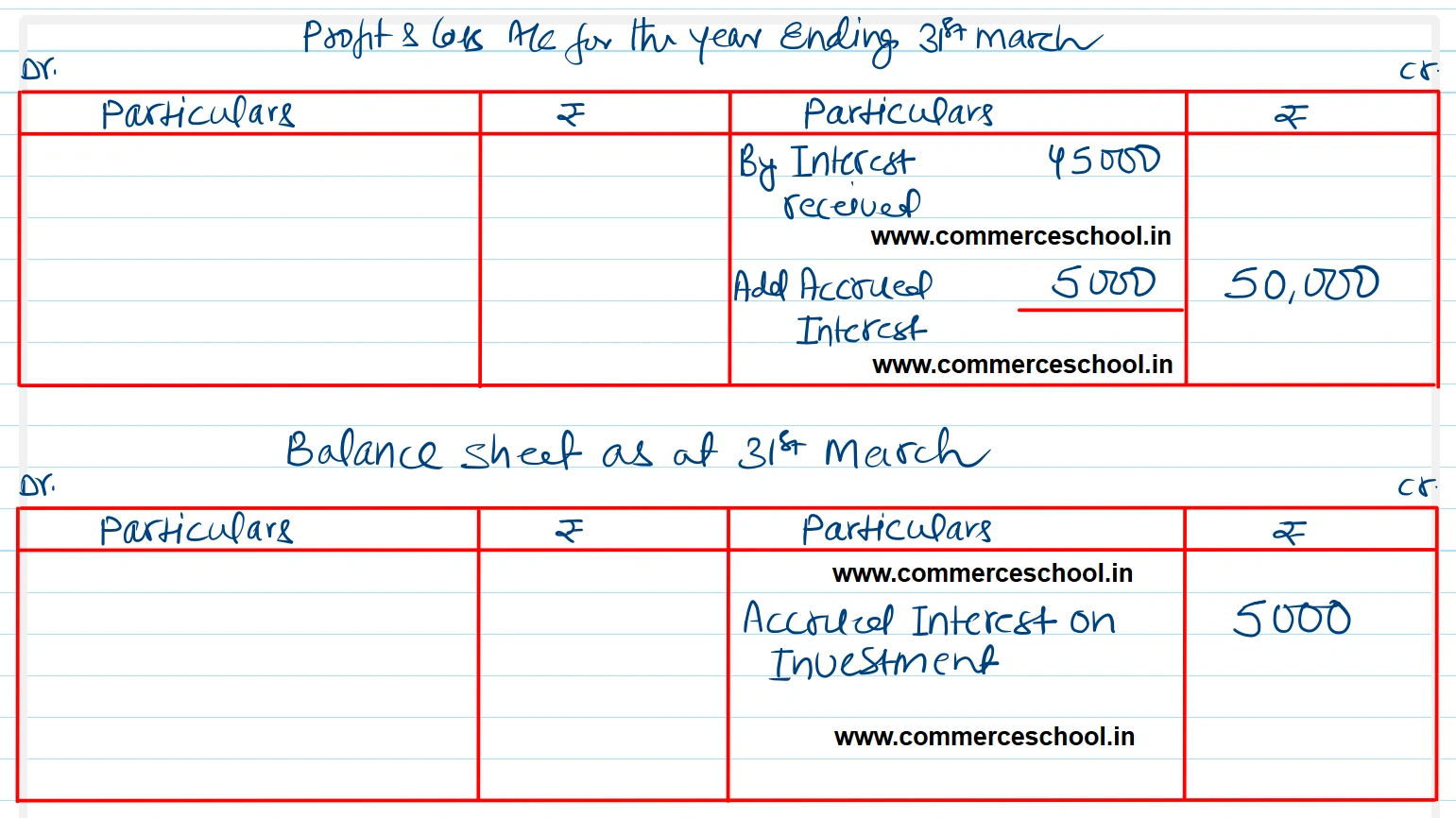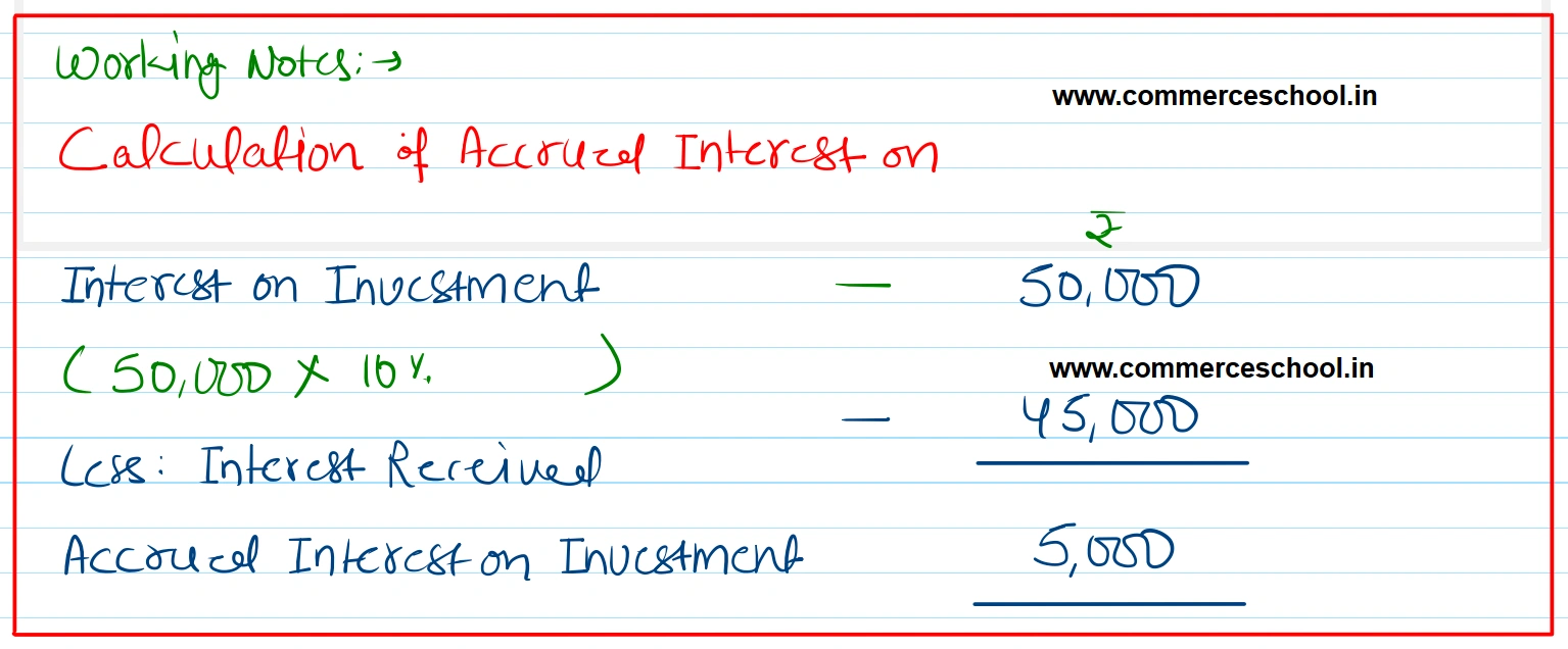 Show how the above items will be shown in the Profit & Loss Account and Balance Sheet. [Ans.: Profit & Loss Account – ₹ 50,000; Assets side of the Balance Sheet (Interst Receivable) – ₹ 5,000.]