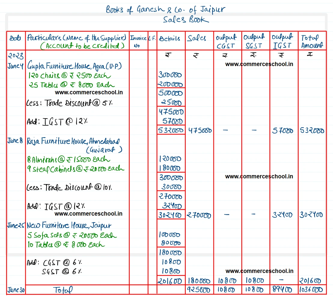 Record the following transactions in the Sales Book of Ganesh & Co. of Jaipur (Rajasthan), who deal in Furniture. Assume CGST @ 6% and SGST @ 6%:-