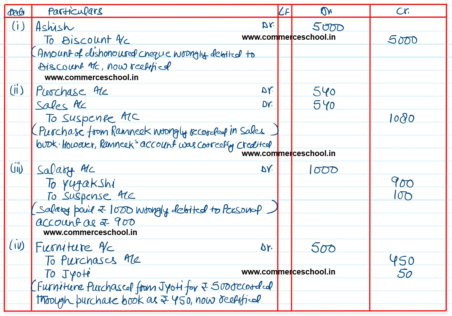 (iv) Furniture costing ₹ 500, purchased from Jyoti, was wrongly entered in Purchase book as ₹ 450.