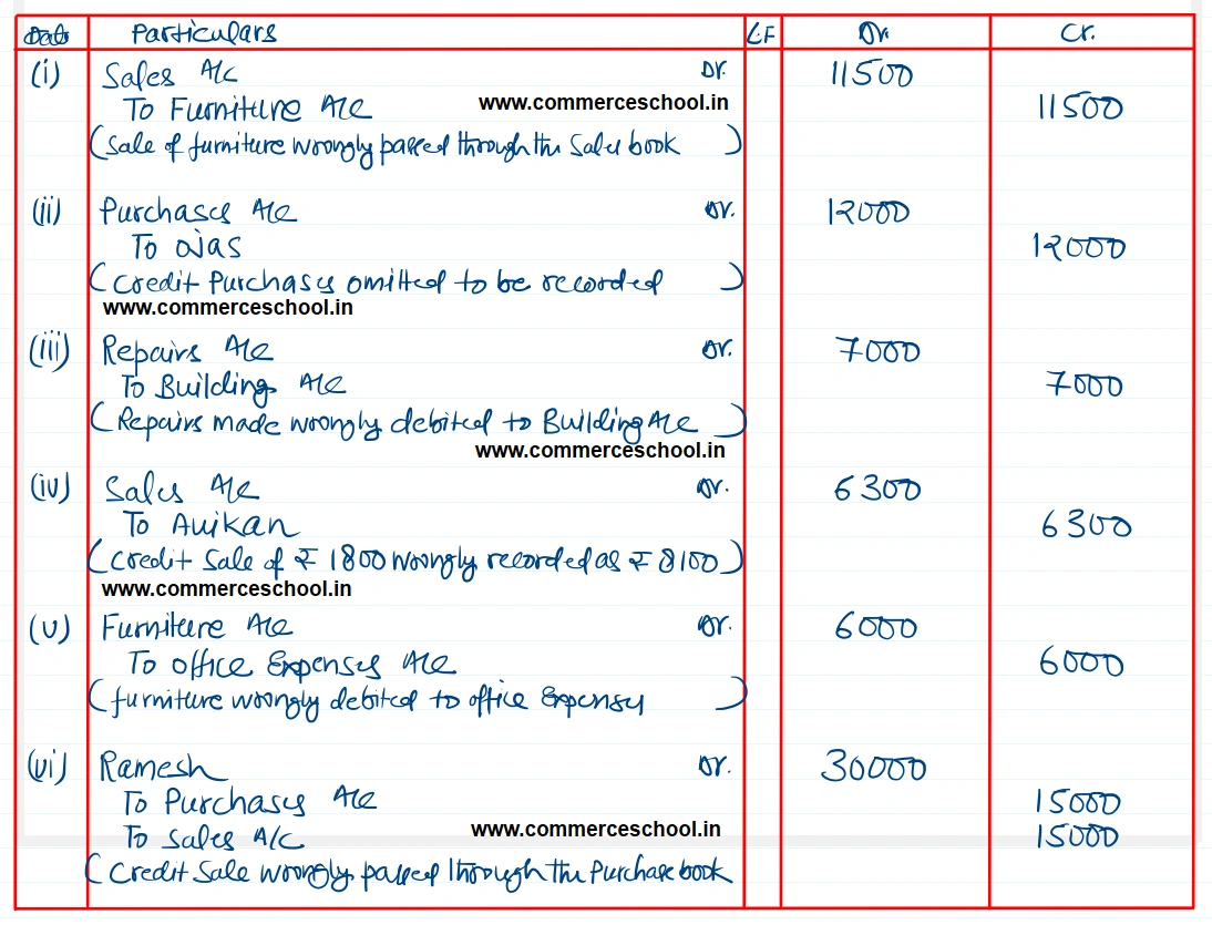 (vi) A credit sale of goods of ₹ 15,000 to Ramesh has been wrongly passed through the Purchases Book.