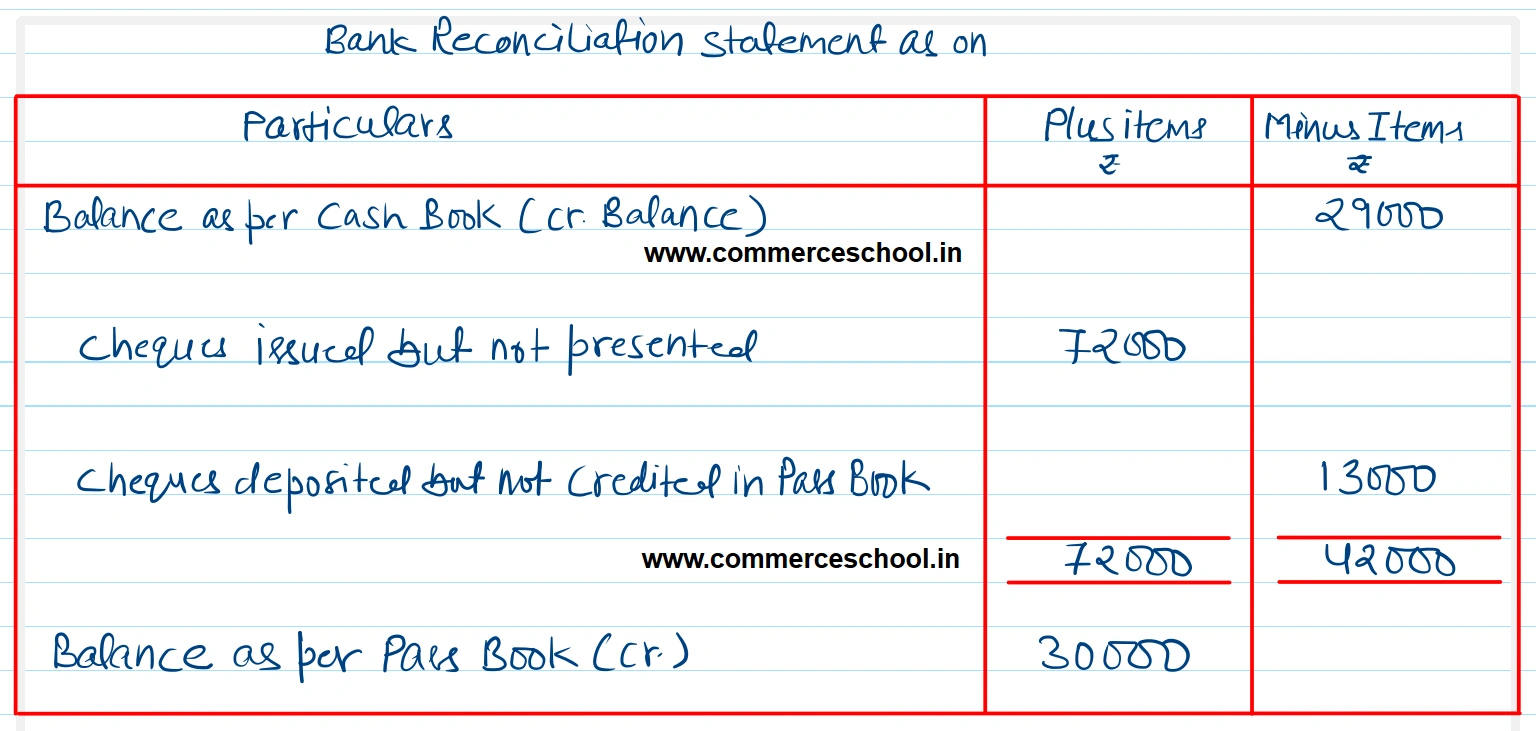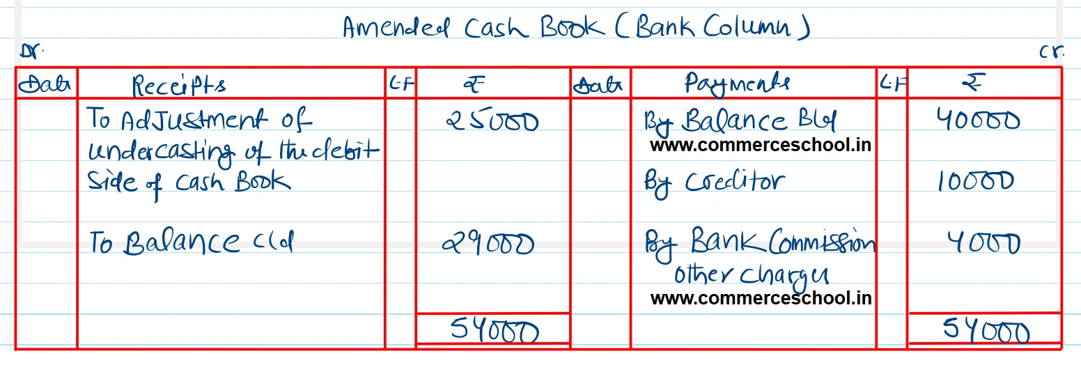 You have been given the following additional information: (a) The debit side of the Cash Book (Bank Column) has been undercast by ₹ 25,000. (b) A cheque for ₹ 10,000 paid to a creditor has been wrongly entered in the Cash Column. (c) Bank commission and other charges ₹ 4,000 have not been recorded in the Cash Book. [Ans. Adjusted balance as per cash Book (Cr. ) ₹ 29,000; Pass Book Cr. Balance ₹ 30,000.]