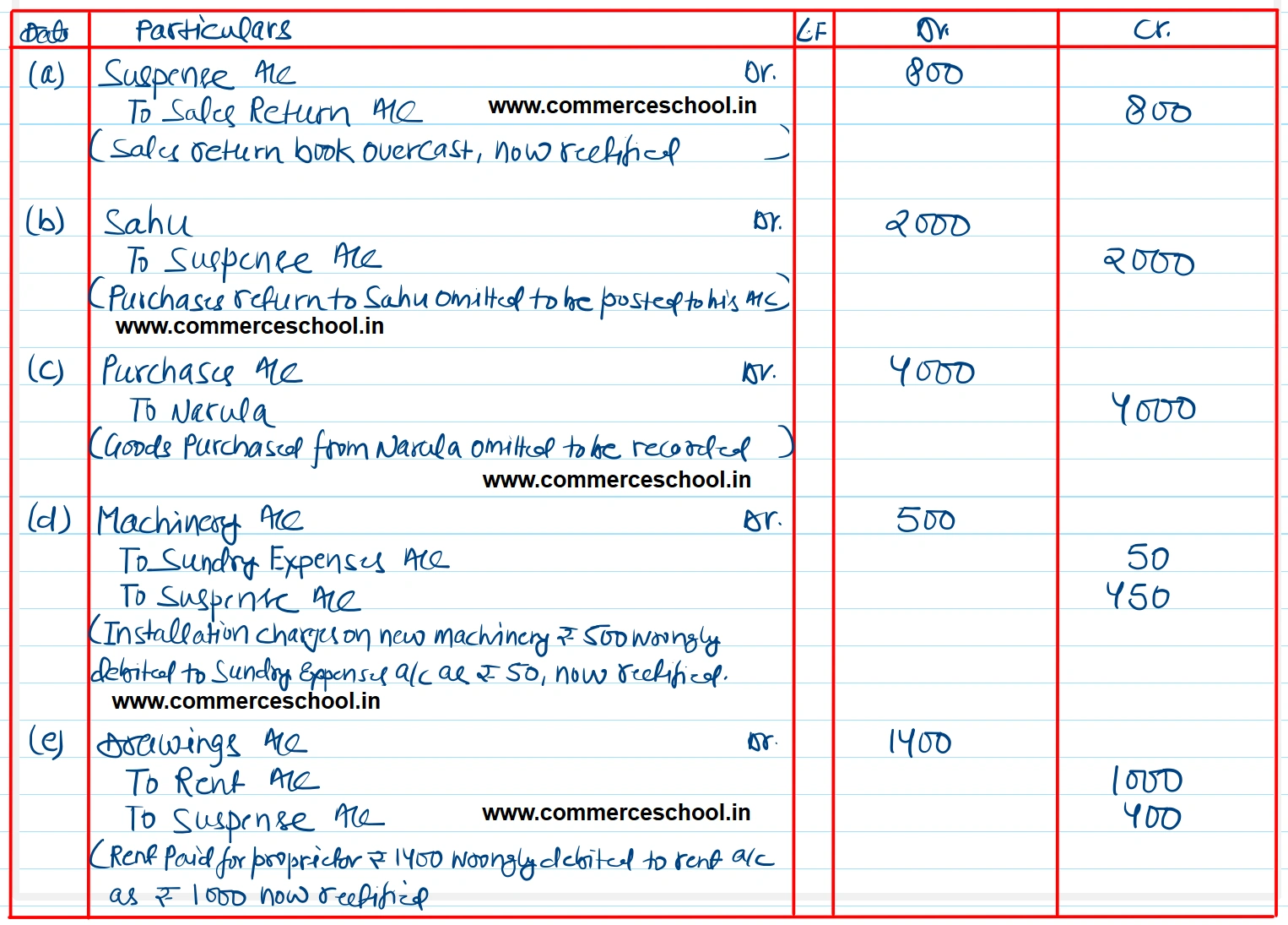 (d) Installation charges on new machinery purchased ₹ 500 were debited to sundry expenses account as ₹ 50.