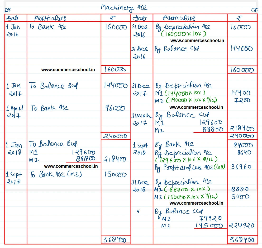 Urja industries Ltd. purchased on 1st January, 2016, a machinery for ₹ 1,60,000. On 1st April, 2017, it purchased additional machinery costing ₹ 96,000. On 1st September, 2018 the machinery purchased on 1st January, 2016 was sold for ₹ 84,000 and on same date fresh machinery was purchased at cost of ₹ 1,50,000. Depreciation is provided at 10% p.a. on diminishing balance method every year. Accounts are closed each year on 31st December. Show machinery account for 3 years.