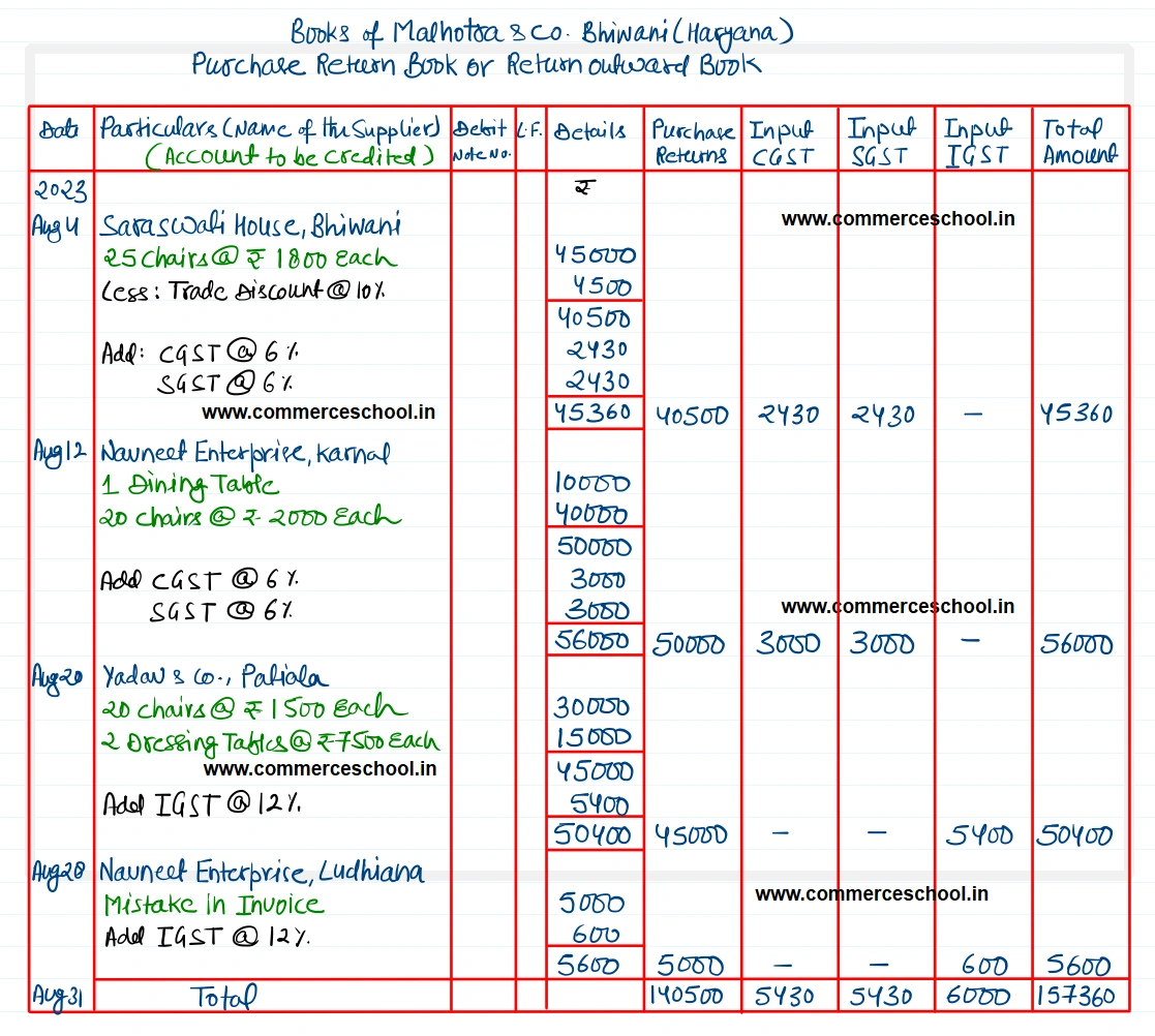 | August 4 | Returned to Saraswati House, Bhiwani 25 Chairs @ ₹ 1,800 per Chair, being not of specified quality Trade Discount 10% |
